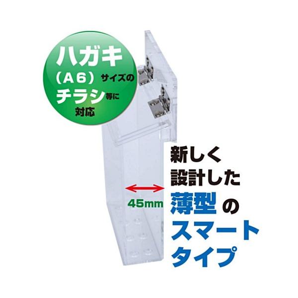 本体サイズ:幅1mm 奥行45mm 高さ165mm 全体のサイズ:幅130mm 高さ2mm 新しく設計した薄型のスマートタイプ。ハガキ(A6)サイズのチラシが入ります。 様々な無人カタログ・チラシ配布BOXとして使用できます。 丈夫なアクリル製で長期の使用ができます。※結束バンド付サイズ A6ハガキサイズ 本体サイズ幅107×底面68×高155mm 用紙サイズ横105×縦148mmサイズ 厚さ2cm未満 重さ1kg未満 送料 ¥300(全国一律) サイズ 厚さ25cm未満 重さ1kg未満 メール便、メール便速達共に事前のご連絡なく宅配便で発送いたします。メール便に限り、 2通(400円)で送りできる場合は、2
